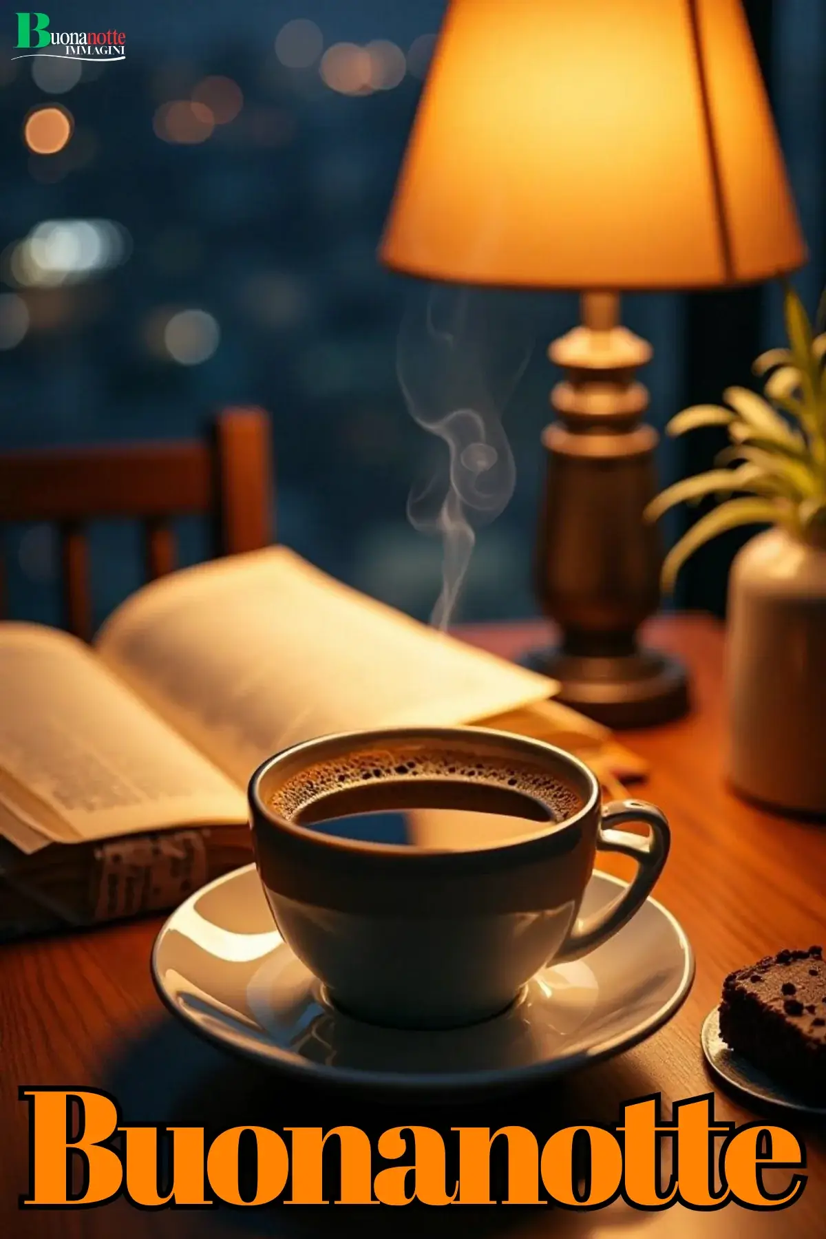 Immagine buonanotte con tazza di caffè fumante, libro aperto e lampada accesa su un tavolo in legno, atmosfera serale intima e raccolta. Perfetta da inviare su WhatsApp a chi ama chiudere la giornata con calma e un momento tutto per sé.