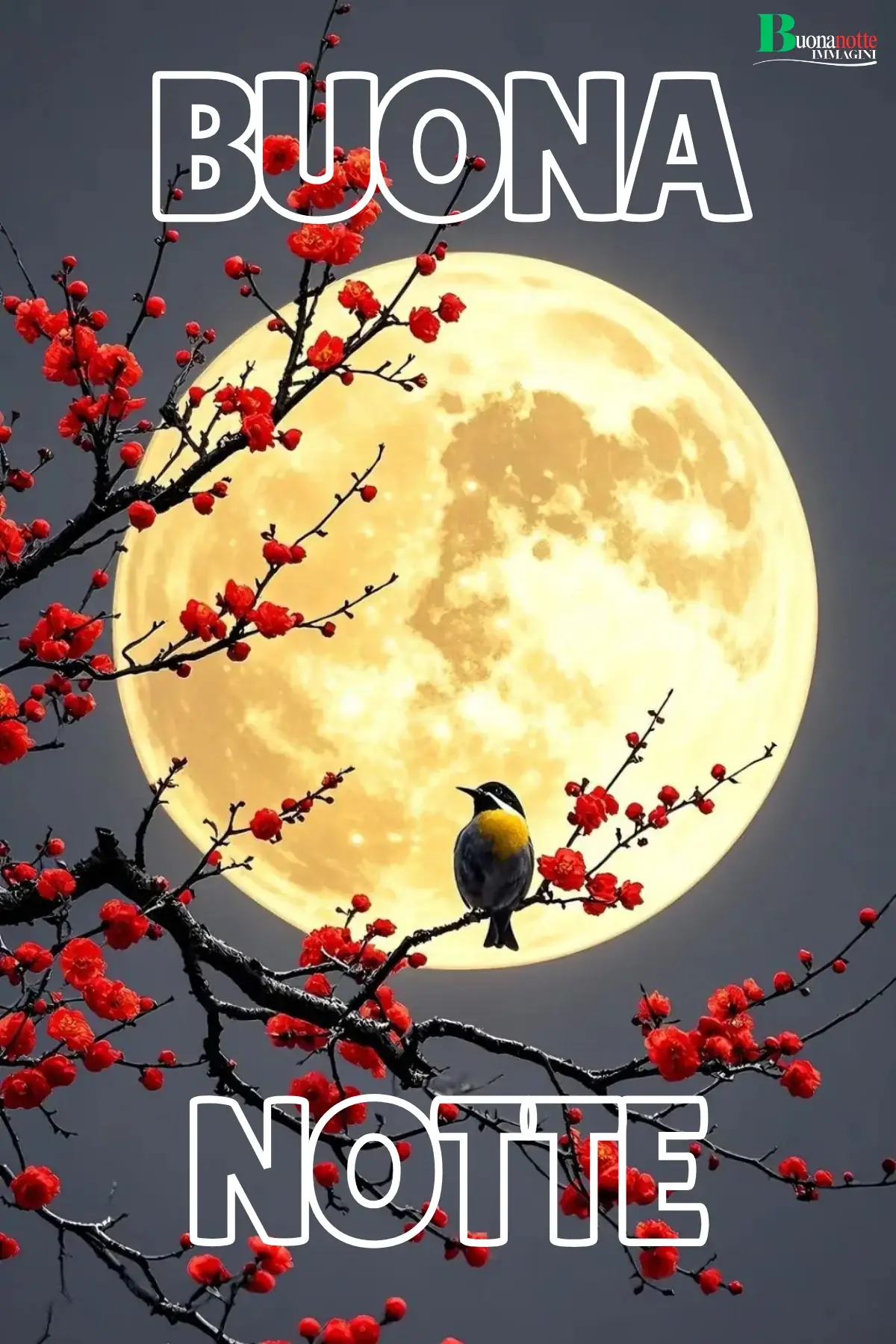 Immagine buonanotte con un uccellino appoggiato su un ramo di fiori rossi, illuminato da una maestosa luna piena dorata. Perfetta da inviare su WhatsApp per augurare una buonanotte poetica e delicata a chi ami.
