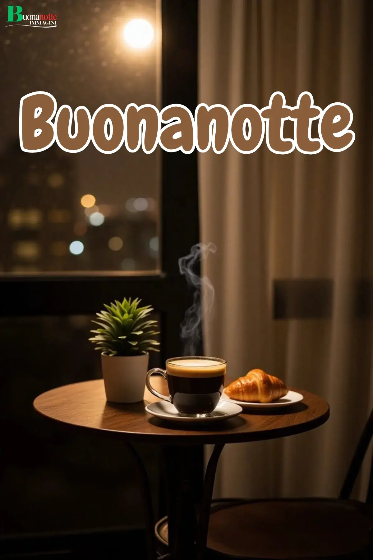 Immagine buonanotte con tazza di caffè fumante, cornetto e piantina su un tavolino rotondo, illuminata dalle luci notturne della città. Perfetta da inviare su WhatsApp a chi ama i momenti di dolce relax prima di dormire.