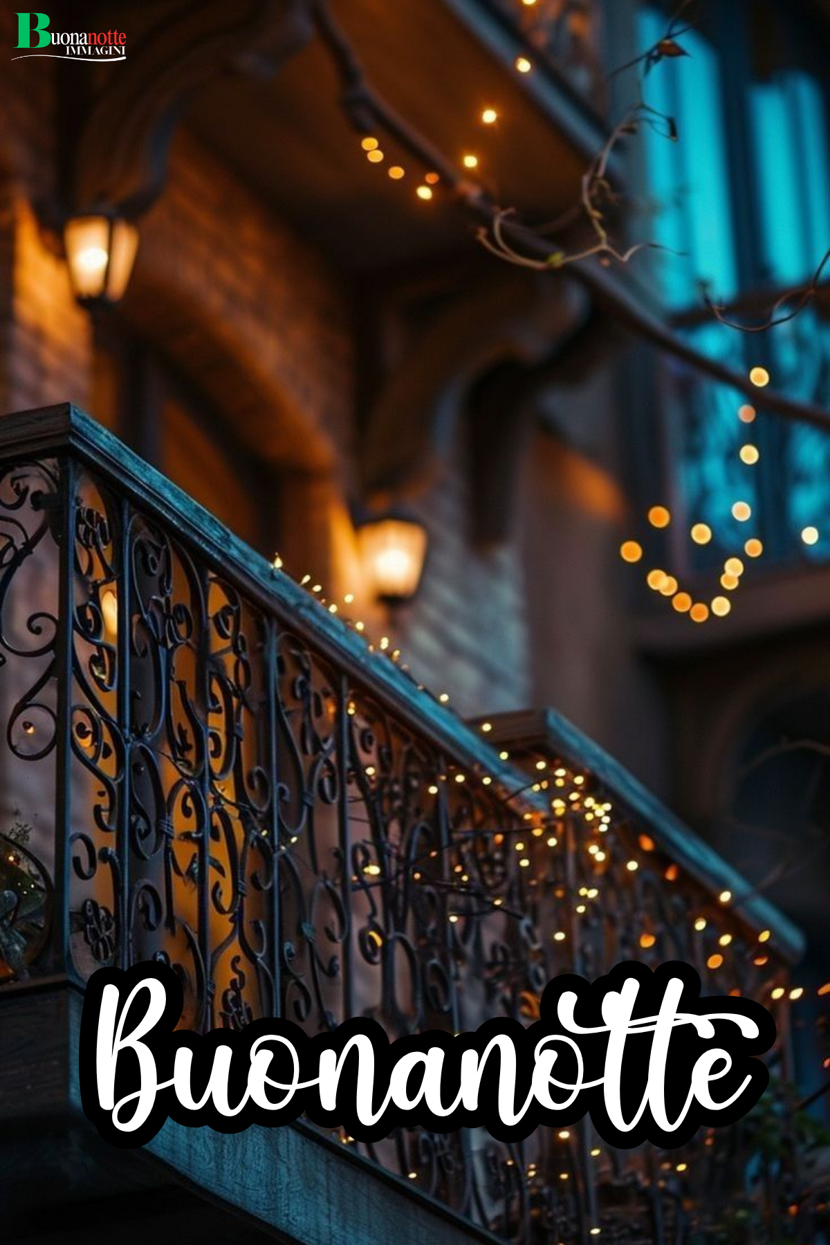 Immagine buonanotte con una scalinata in ferro battuto decorata da lucine calde che brillano nella penombra serale. Perfetta da inviare su WhatsApp a chi ama l'atmosfera romantica delle sere d'estate nei borghi italiani.