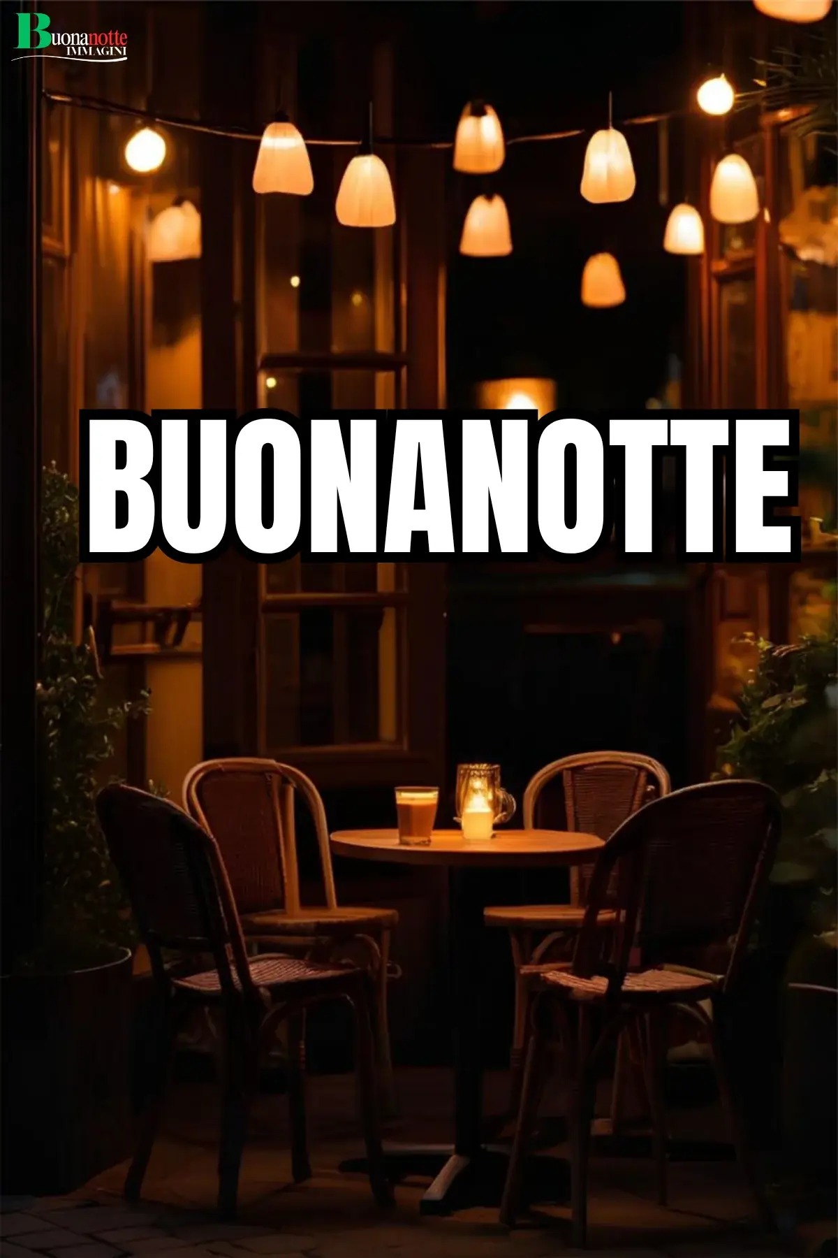 Immagine buonanotte con tavolino di un caffè all'aperto illuminato da lanterne calde e una candela accesa nella notte. Perfetta da inviare su WhatsApp a chi ama l'atmosfera intima delle sere d'estate.