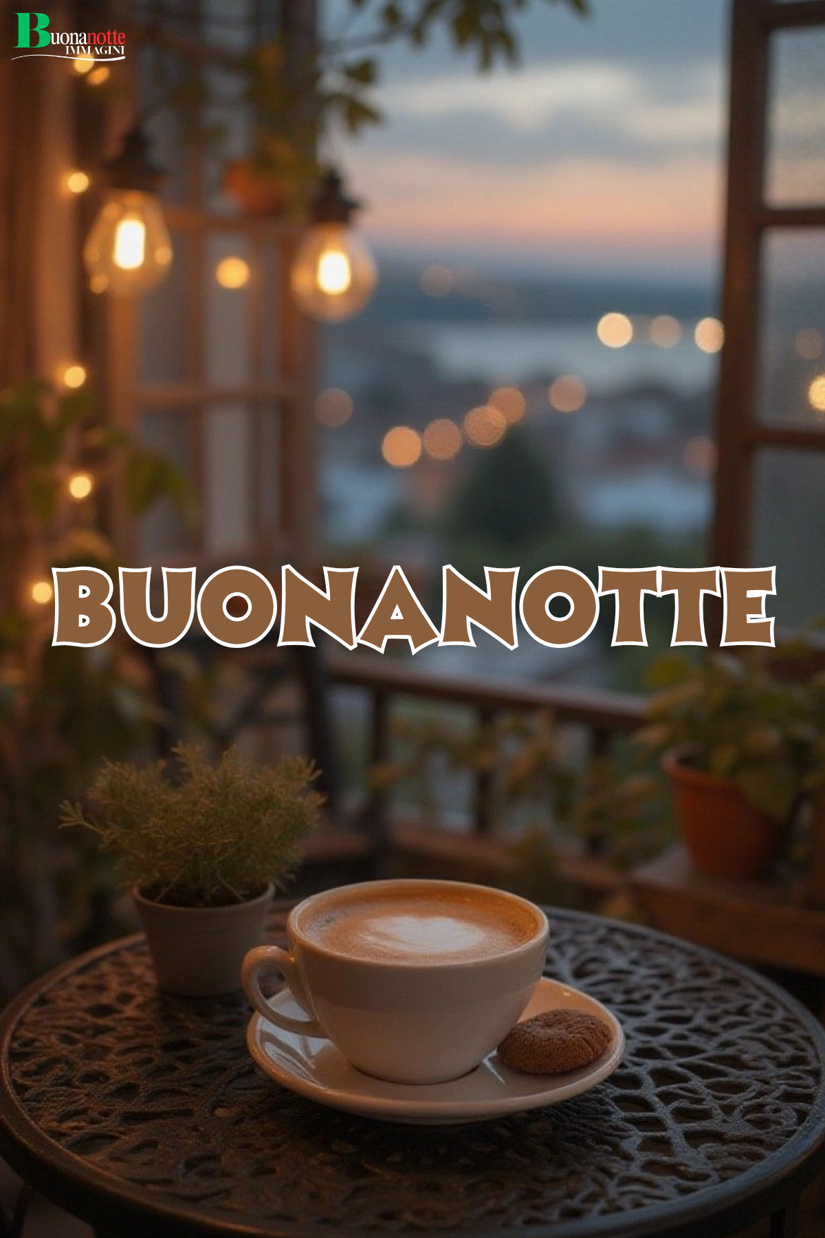 Immagine buonanotte con una tazza di cappuccino su un tavolino di balcone decorato con lucine e piantine, sullo sfondo il tramonto sulla città. Perfetta da inviare su WhatsApp a chi ama chiudere la giornata con un momento di calma e dolcezza.