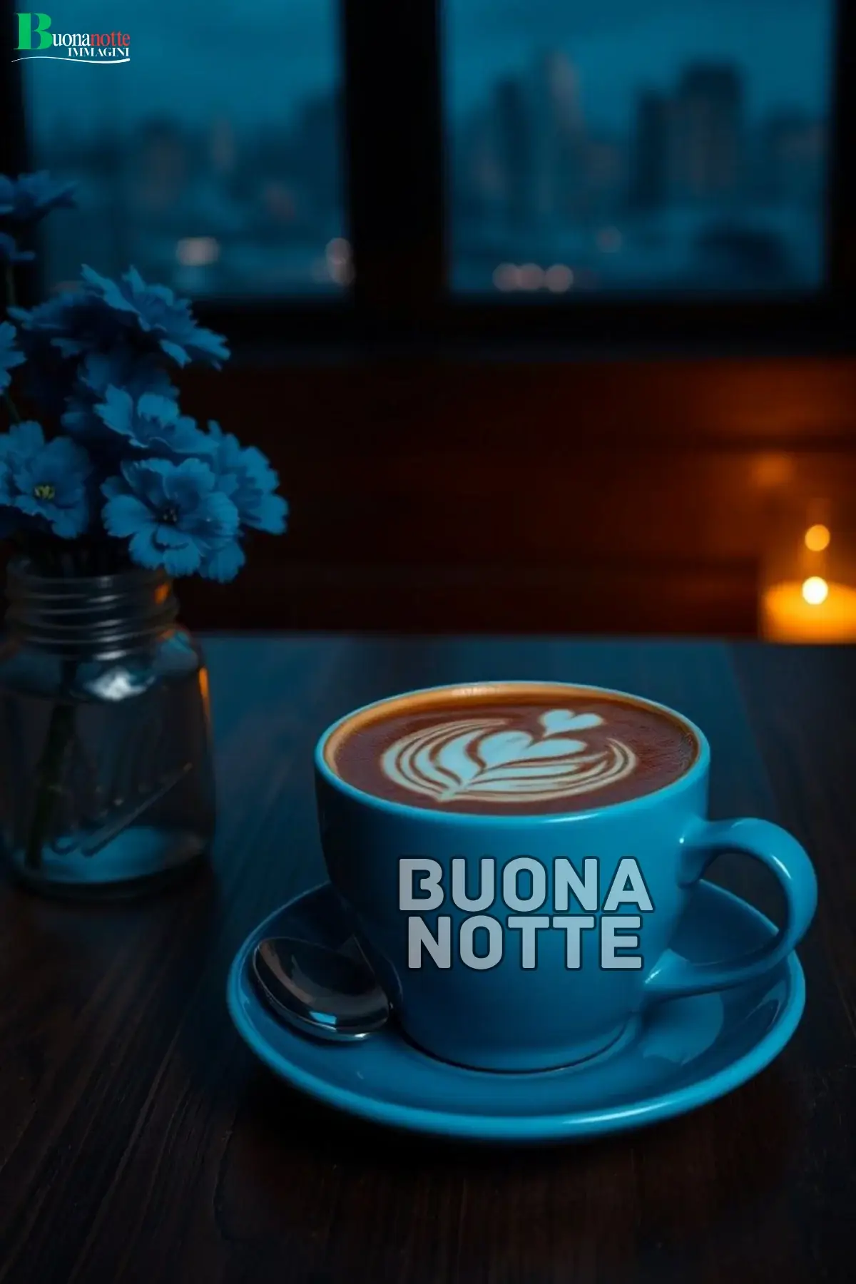 Immagine buonanotte con tazza di cappuccino azzurra decorata con cuore di latte, fiori blu e luce soffusa di candela sullo sfondo della città notturna. Perfetta da inviare su WhatsApp a chi ama chiudere la giornata con un gesto caldo e raffinato.