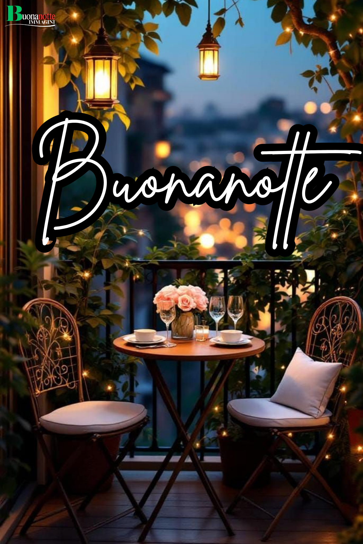 Immagine buonanotte con un romantico balcone serale apparecchiato per due, illuminato da lanterne e lucine tra il verde. Perfetta da inviare su WhatsApp alla persona speciale per chiudere la giornata con dolcezza.