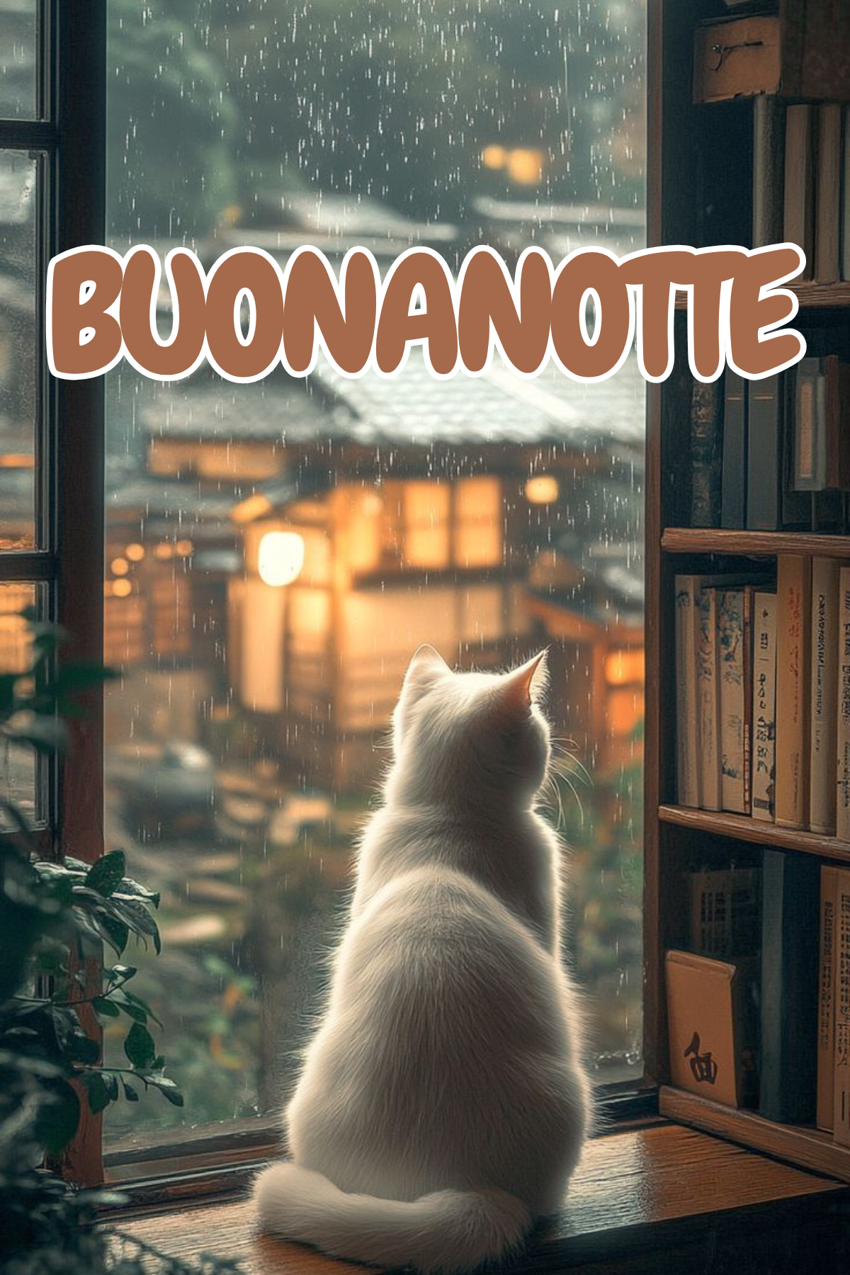 Immagine buonanotte con un gattino bianco che guarda la pioggia dalla finestra di una stanza accogliente piena di libri. Perfetta da inviare su WhatsApp nelle sere di pioggia per augurare dolci sogni a chi ami.