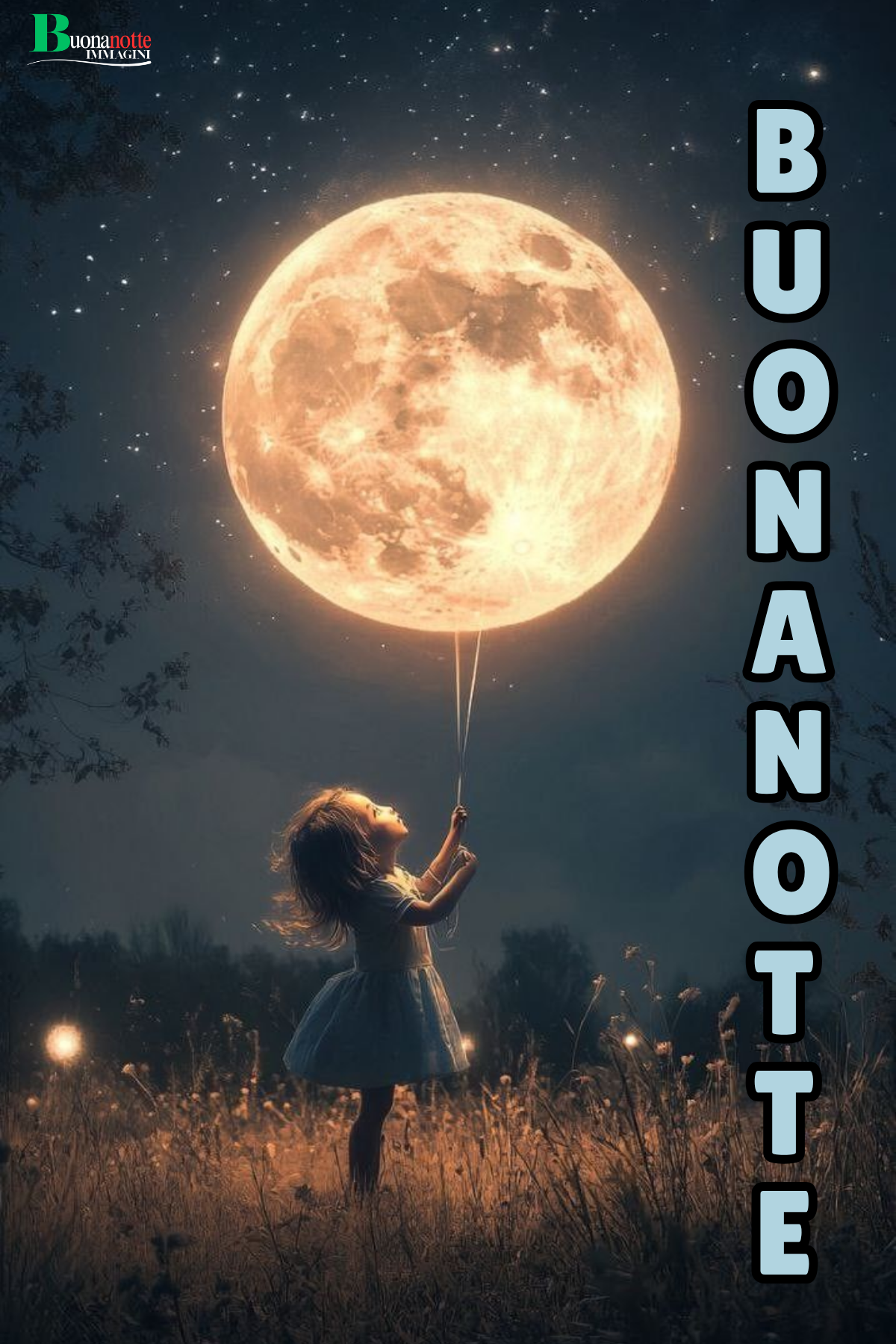 Immagine buonanotte con una bambina che regge la luna piena come un palloncino luminoso in un prato sotto le stelle. Perfetta da inviare su WhatsApp per augurare sogni magici a chi ami prima di dormire.