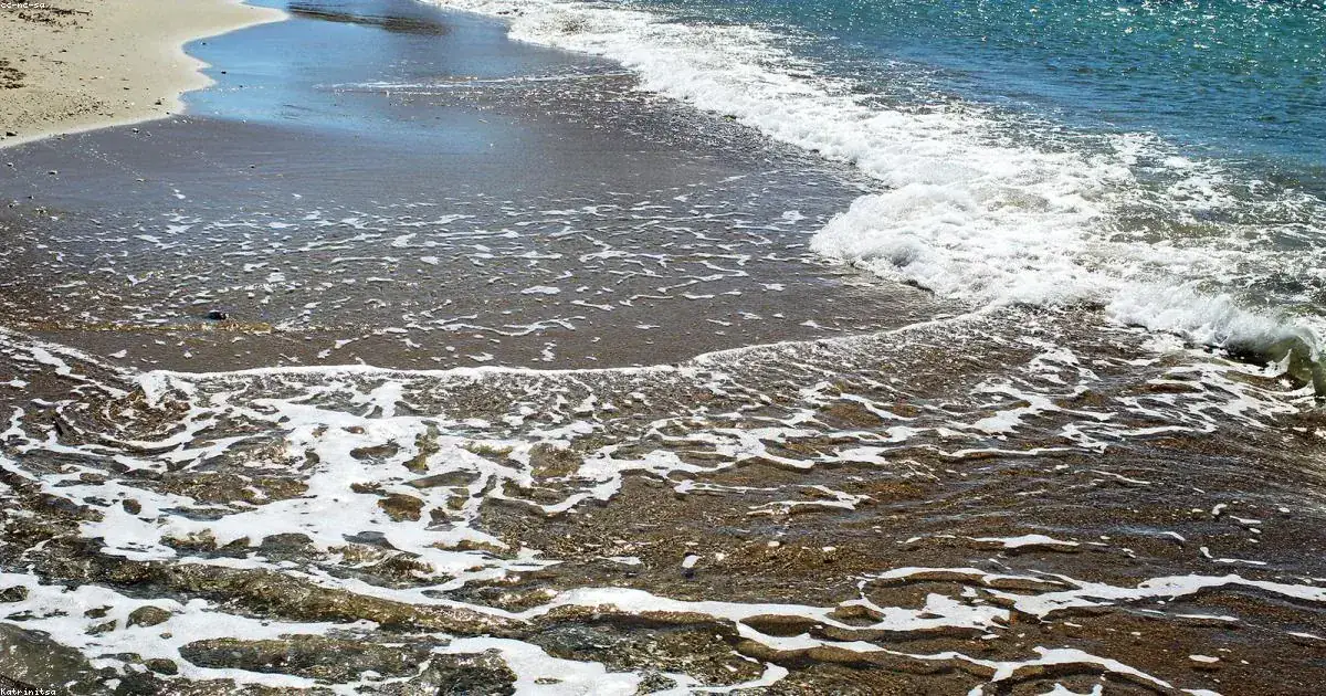 Questa immagine di buonanotte estiva mostra onde spumeggianti che accarezzano la battigia di una spiaggia dorata, con il mare cristallino sullo sfondo. Perfetta da inviare su WhatsApp nelle calde sere d'estate per augurare una buonanotte calda estiva a chi ama il mare.
