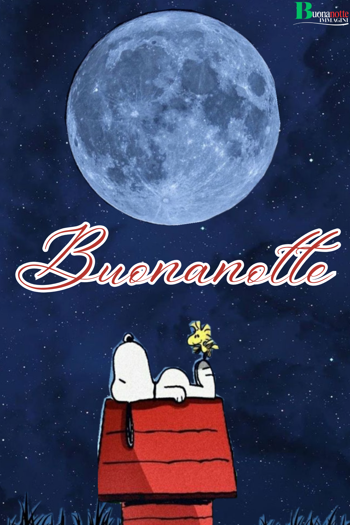 «Snoopy e Woodstock dormono sulla cuccia rossa sotto una luna piena enorme in una notte stellata d'estate.»