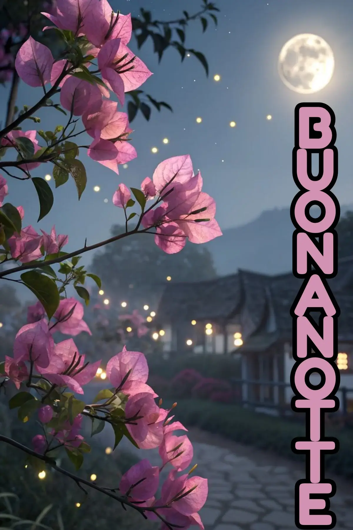 Immagine buonanotte con bouganville rosa illuminate dalla luna piena, lucciole scintillanti e una casetta immersa nella quiete notturna. Perfetta da inviare su WhatsApp a chi ama i fiori e le atmosfere romantiche prima di dormire.