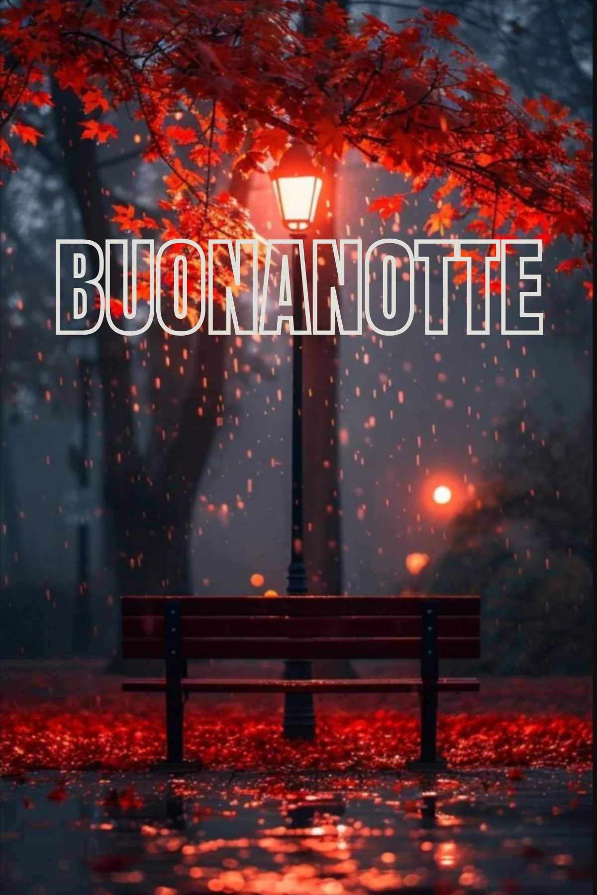 «La pioggia cade dolcemente sulla panchina illuminata dal lampione tra le foglie rosse d'autunno. Buonanotte serena.»