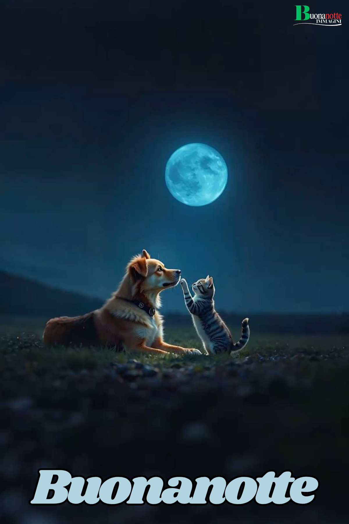 Immagine buonanotte tenera con un cane e un gattino tigrato che si toccano il muso sotto una grande luna piena luminosa. Perfetta da inviare su WhatsApp a chi ami gli animali, per augurare una notte serena e piena di dolcezza.