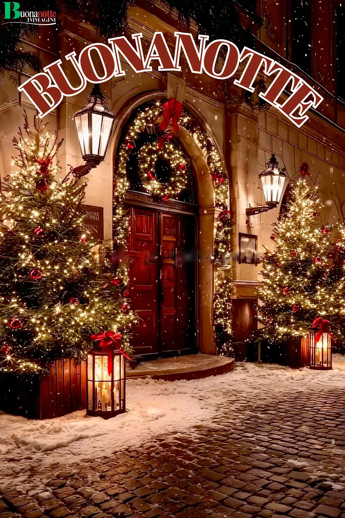 Immagine buonanotte natalizia con un portone elegante incorniciato da alberi illuminati, ghirlanda e lanterne sulla neve che cade. Perfetta da inviare su WhatsApp nelle sere di dicembre per augurare una notte avvolta nella magia del Natale.