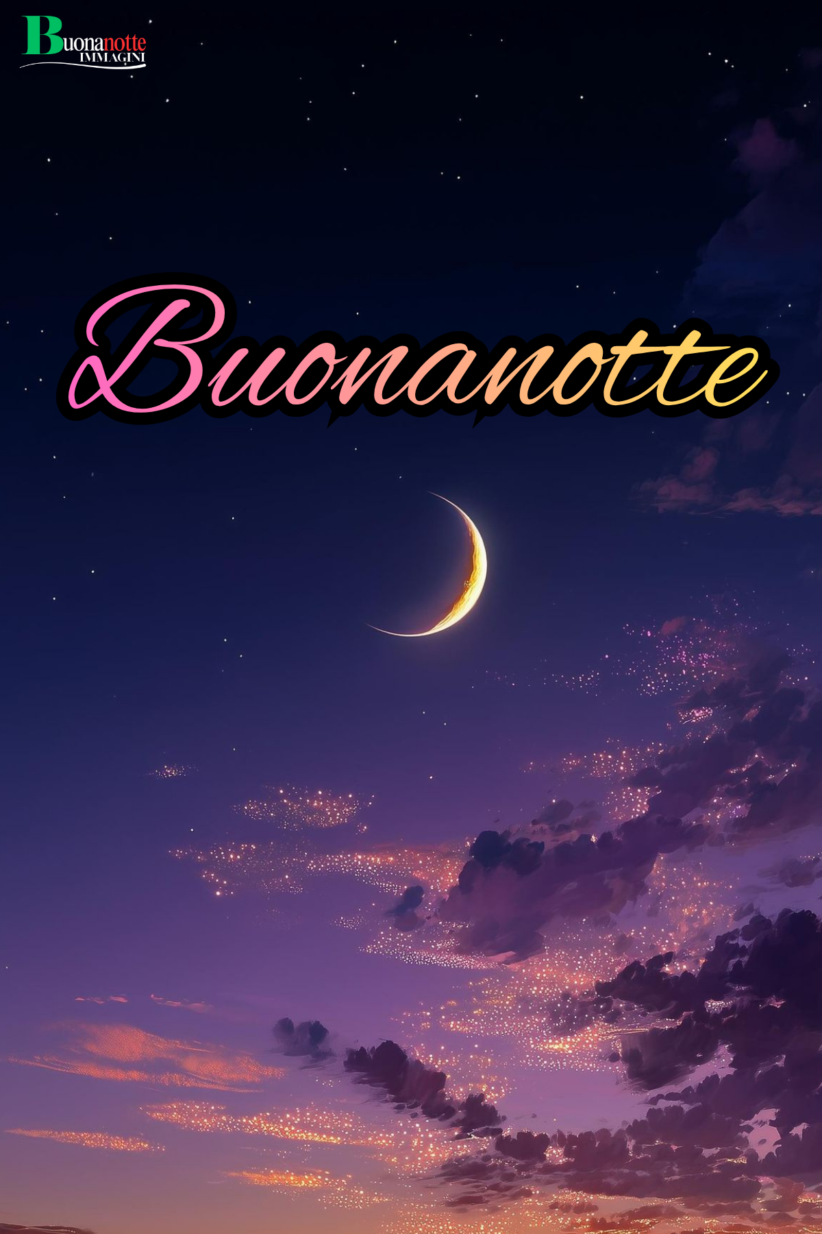 Nuovissimo buonanotte immagini recenti con falce di luna luminosa su un cielo viola ricco di nuvole scintillanti. Perfetta da inviare a chi ami per chiudere la giornata con dolcezza.