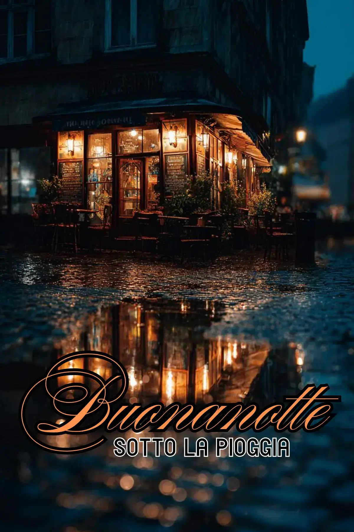 Angolo caffè europeo sotto la pioggia, luci calde sul ciottolato bagnato; testa «Buonanotte sotto la pioggia» per auguri serali intimi.