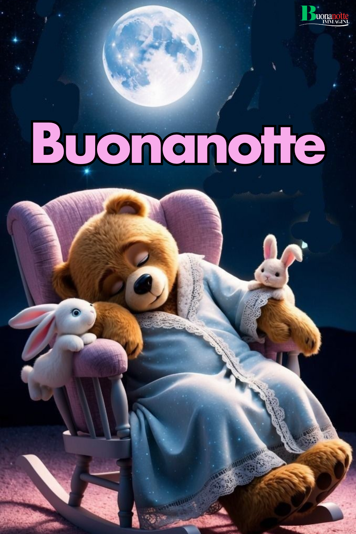 «Sotto la luna piena, un orsacchiotto in camicia da notte dorme beato sulla sedia a dondolo abbracciando i suoi coniglietti. Sogni d'oro a tutti! 🌙🧸»