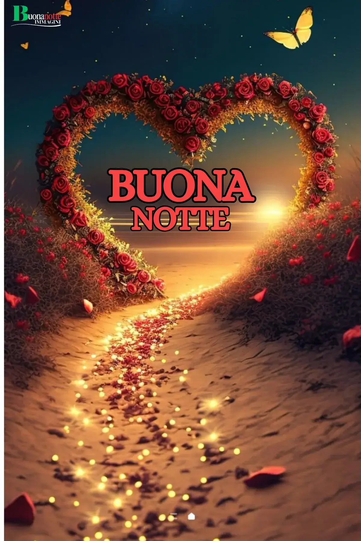 Immagine buonanotte romantica con un cuore di rose rosse che incornicia un tramonto dorato, un sentiero luminoso di petali e una farfalla. Perfetta da inviare su WhatsApp alla persona che ami prima di addormentarti.