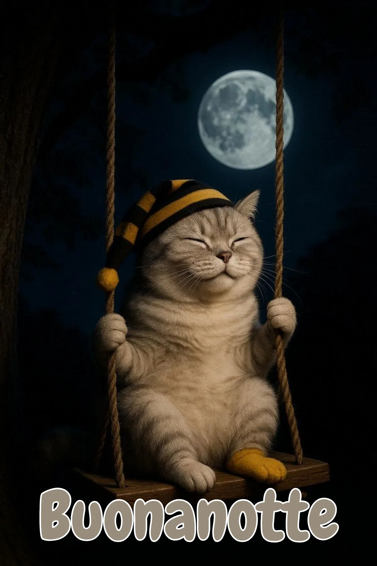 Immagine buonanotte con un gattino sorridente seduto su un'altalena sotto la luna piena, con un adorabile berrettino a righe gialle e nere. Perfetta da inviare su WhatsApp per strappare un sorriso tenero prima di dormire.