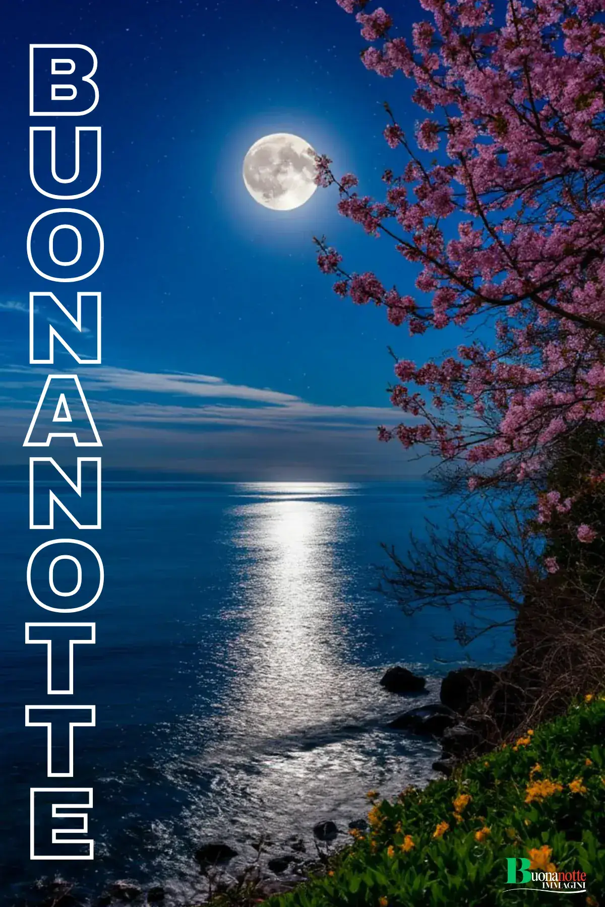 Immagine buonanotte con luna piena che si riflette sul mare calmo, incorniciata da rami di ciliegio in fiore e ginestre dorate. Perfetta da inviare su WhatsApp nelle sere di primavera per augurare buonanotte con un tocco romantico e poetico.