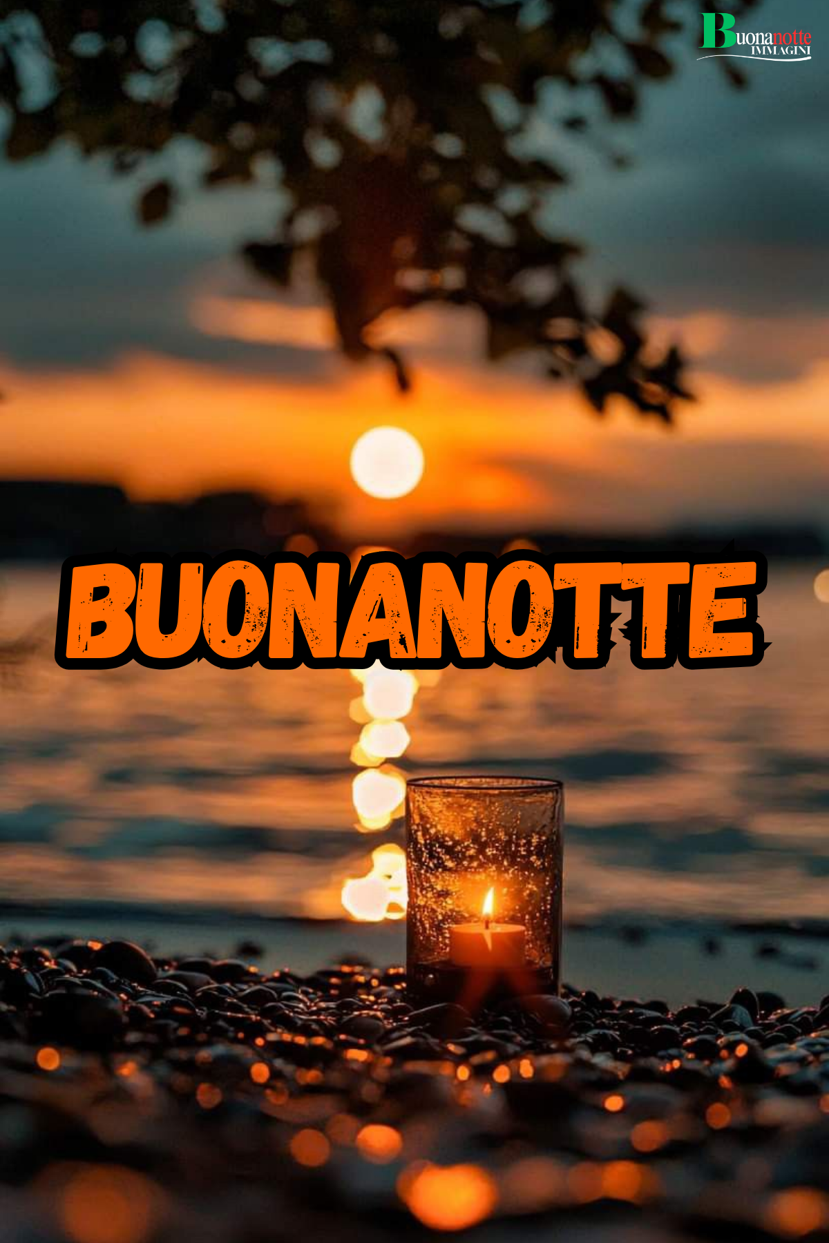 Immagine buonanotte con una candela accesa tra i ciottoli sulla riva del mare al tramonto, avvolta da riflessi dorati sull'acqua. Perfetta da inviare su WhatsApp a chi ama la tranquillità del mare per augurare una buonanotte piena di pace.