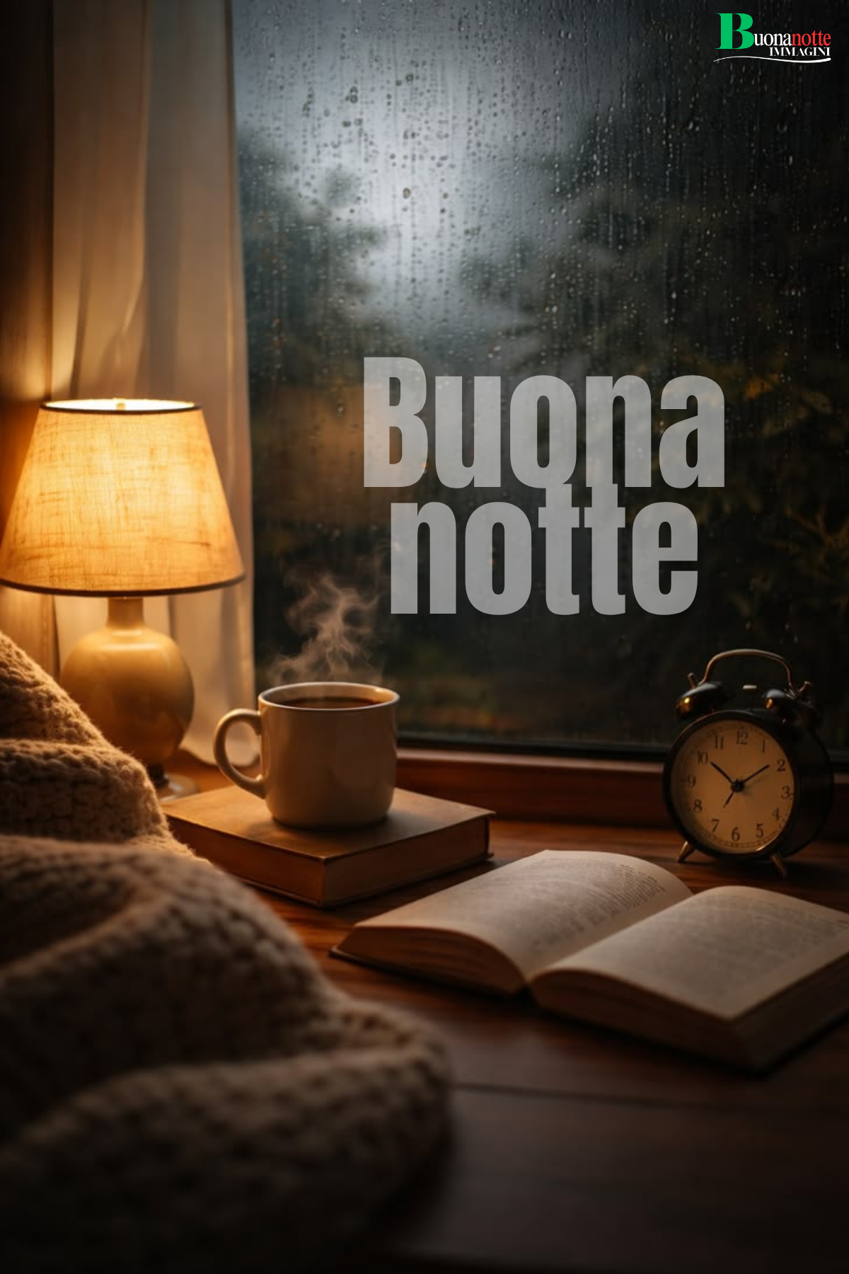 Immagine buonanotte con atmosfera intima e raccolta: una lampada accesa, una tazza fumante, un libro aperto e la pioggia che scorre sul vetro della finestra. Perfetta da inviare su WhatsApp nelle sere di pioggia per augurare buonanotte con un tocco di calore e intimità.