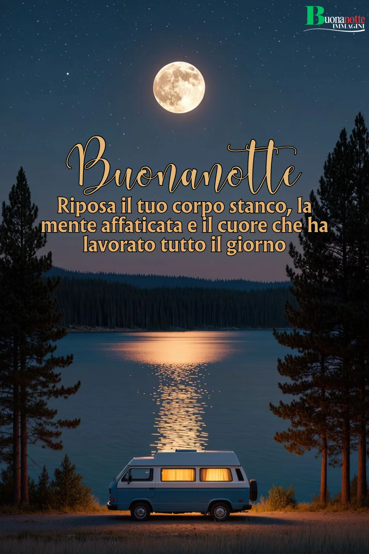 Immagine buonanotte con luna piena riflessa su un lago e un furgoncino camper illuminato tra i pini, perfetta per chi ama la natura. Tra le frasi buonanotte più belle da inviare su WhatsApp a chi ha bisogno di staccare dopo una giornata pesante.