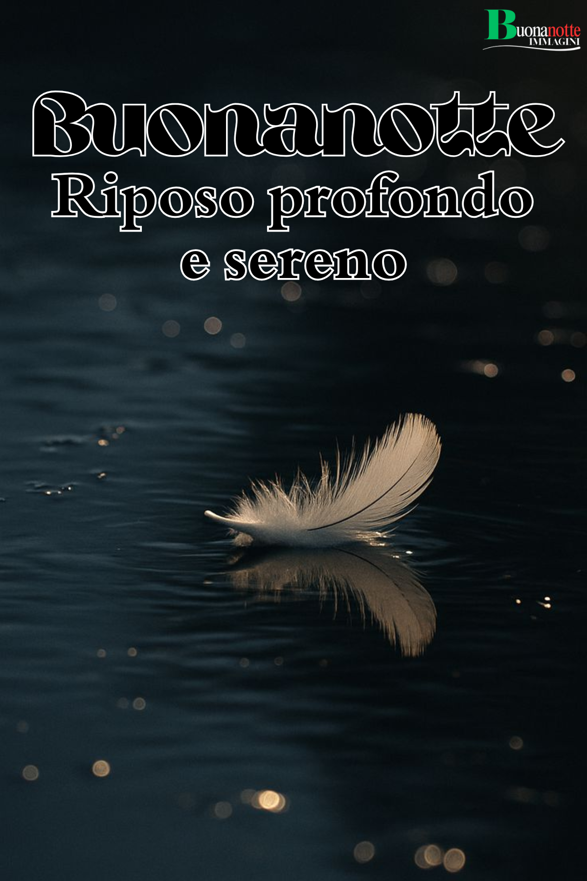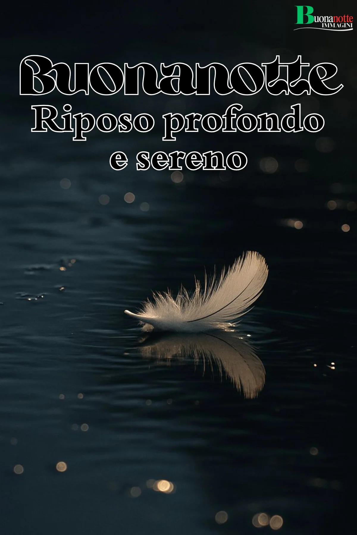 Immagine buonanotte con una piuma bianca che galleggia delicatamente su acqua scura, accompagnata dalla frase riposo profondo e sereno. Perfetta come frase buonanotte da inviare su WhatsApp a chi ha bisogno di leggerezza dopo una giornata pesante.